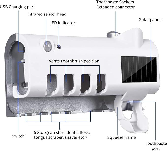 Smart UV Toothbrush Holder and Toothpaste Dispenser Bathroom Toothbrush Holder Wall Mounted Toothpaste Dispenser with Rechargeable Solar Powered Rechargeable USB Charging